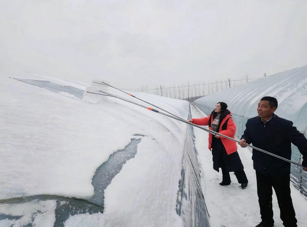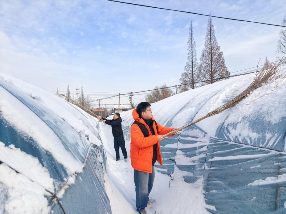 平安产险扬州中心支公司在江都蔬菜大棚片区,协助种植户清理棚顶积雪、加固薄弱棚体,指导农户对棚内作物采取多层覆盖保温措施。