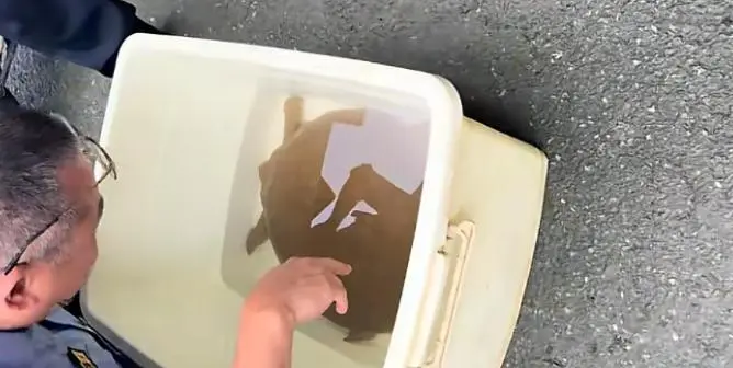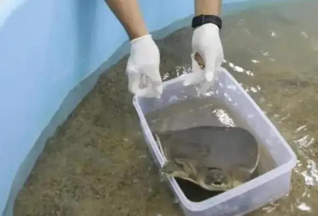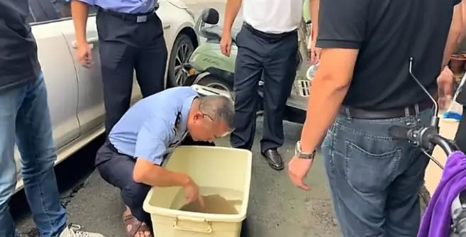 黄先生对这个结论非常确定,他本身就认得出鼋(yuán),而且刚好不久前在潮州市海综支队微信公众号看到过对鼋的宣传推文。他于是火速将这只鼋从渔网中解救出来,带回家放在大鱼箱中养着,也不敢乱喂东西,当时已经是深夜,隔天早上他就联系了潮州市海综支队,顺便拍了视频,发布到自己的账号“@潮州市江东镇阿龙韩江鱼”上跟网友们分享。