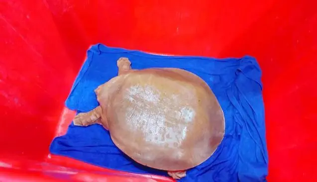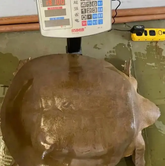 在场的人都很兴奋,这果然就是一只鼋!而且状态相当好!经过测量,其身长45厘米,宽度喂35厘米,体重11.8市斤。虽然已经很大了,但对鼋这个物种来说,就是个小卡拉米,因为鼋的极限个体体重可达200斤,体长可达1.2米!鼋本来就是是淡水龟鳖类中体型最大的几个物种之一,也难怪《西游记》中通天河的巨龟会以鼋为原型。
